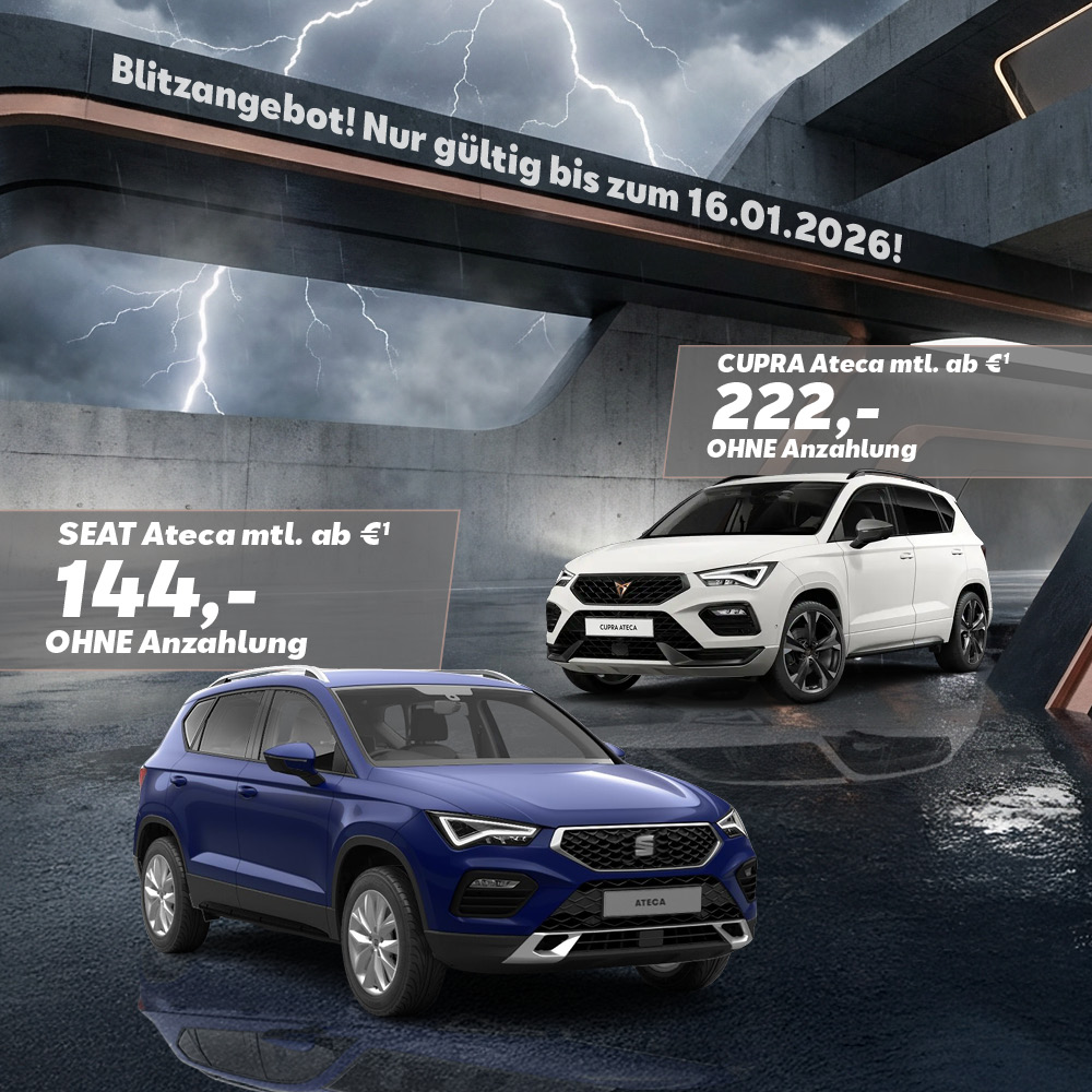 1) Sonderzahlung 0,- €; Laufzeit 24 Monate; Jährliche Fahrleistung 10.000 km. PrivatLeasing-Angebote der SEAT Leasing, Zweigniederlassung der Volkswagen Leasing GmbH, Gifhorner Straße 57, 38112 Braunschweig, für Privatkunden. Bonität vorausgesetzt. Die Angebote sind nicht kombinierbar mit anderen Sonderaktionen. Zzgl. Überführungs- und Zulassungskosten. Abbildungen zeigen Sonderausstattungen. Die aufgeführten Ausstattungen sind abhängig von Modell sowie Modellvariante erhältlich. Angebot gültig bis zum 16.01.2026.